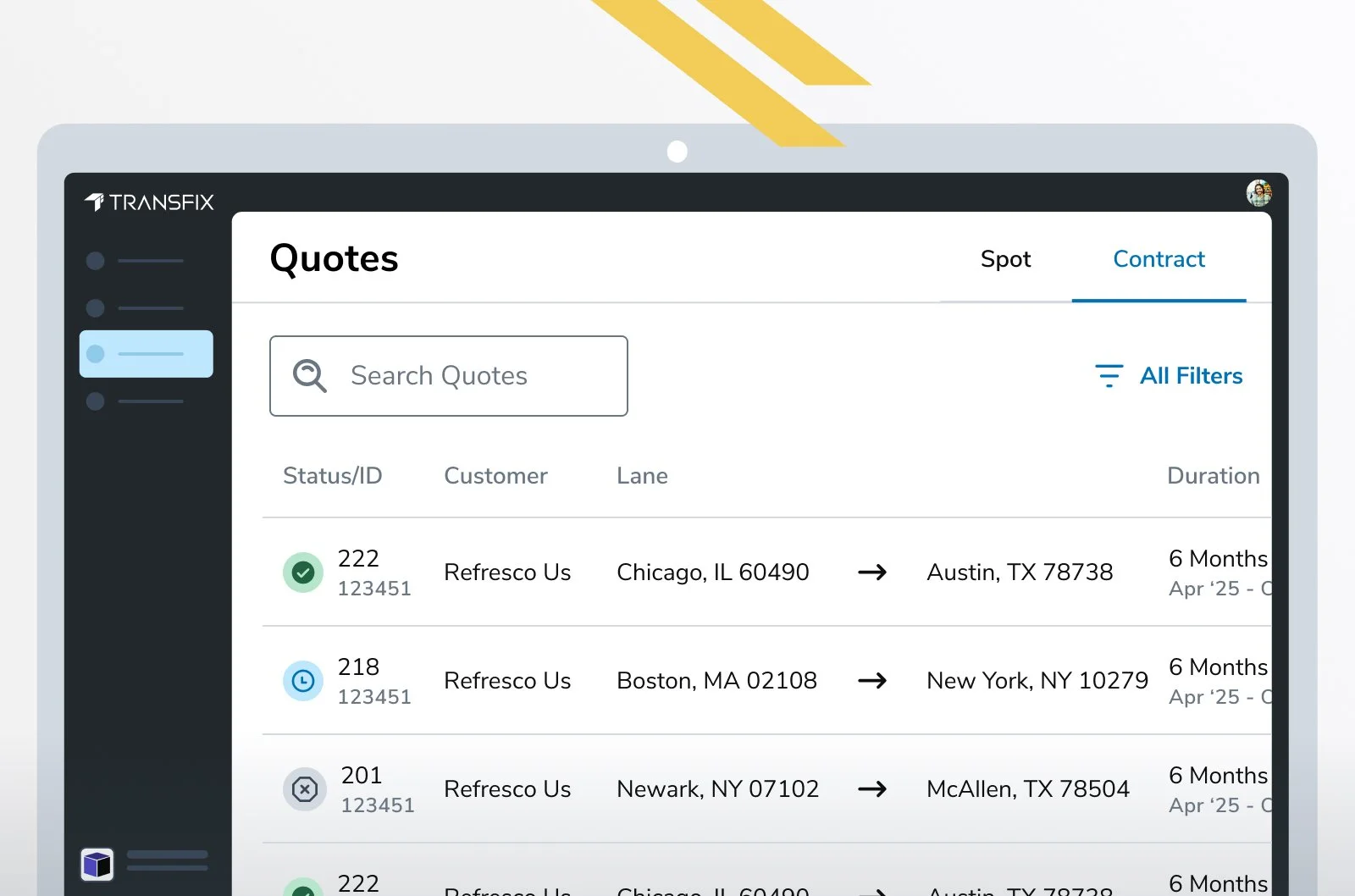 The Transfix Quotes Tool gives your team a single source of truth for every spot and contract rate you submit. Save, sort, and filter quotes across your organization, and track status updates like wins, losses, and rate overrides — complete with detailed reason codes. Whether you generate a quote through our platform or via API, you’ll never lose visibility.